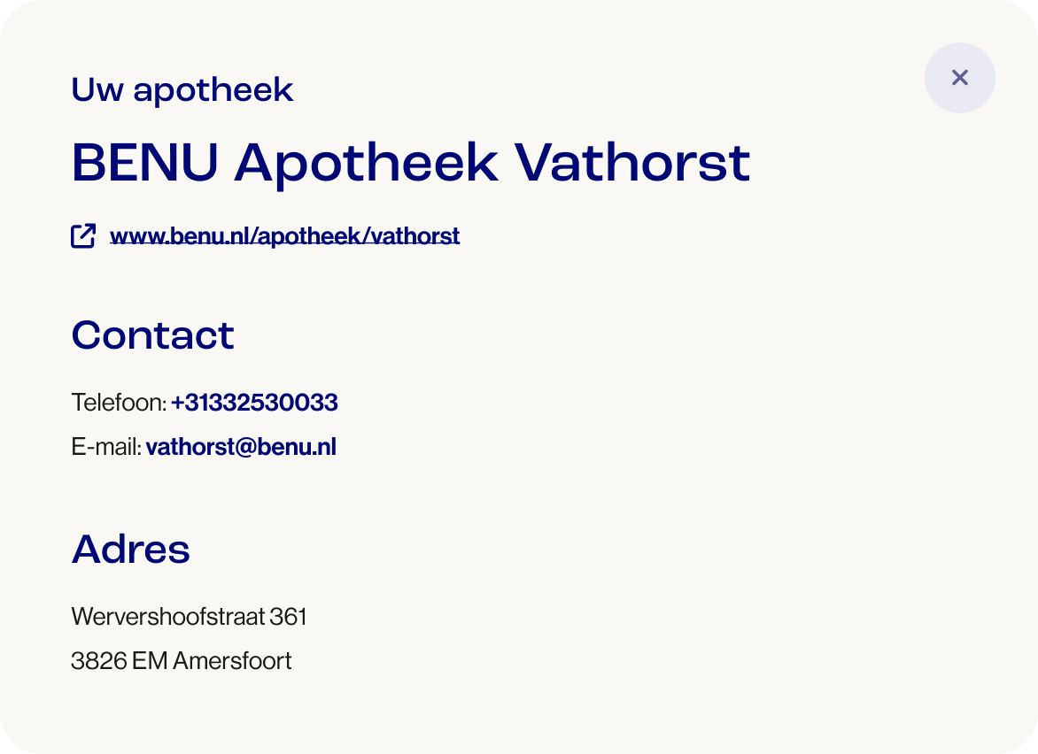 De apotheek is zichtbaar op elke medicijnpagina die zij versturen. Zo kunnen hun patienten snel en eenvoudig contact opnemen als ze toch nog vragen hebben.