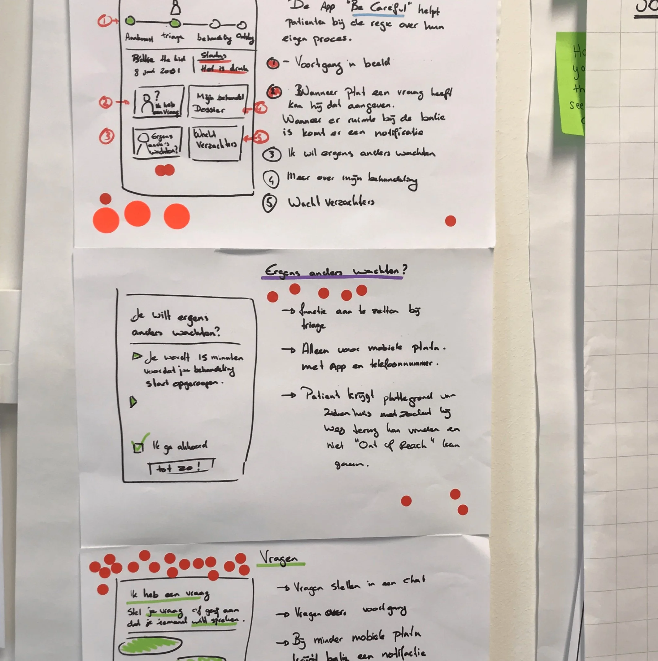 Tijdens de analysefase kwamen we erachter dat het belangrijk is om de patiënt inzicht te geven in het proces wat zich afspeelt rondom de SEH, dat we de regie meer bij de patiënt moesten leggen en dat de patiënt het fijn vindt meer persoonlijke aandacht te krijgen. Deze inzichten vertaalden we in ideeen. Eerst op post-its, later in schetsen. Met een handige stemprocedures (dot votes!) werd het beste concept gekozen, om dit vervolgens om te zetten in een aantrekkelijk design en prototype.