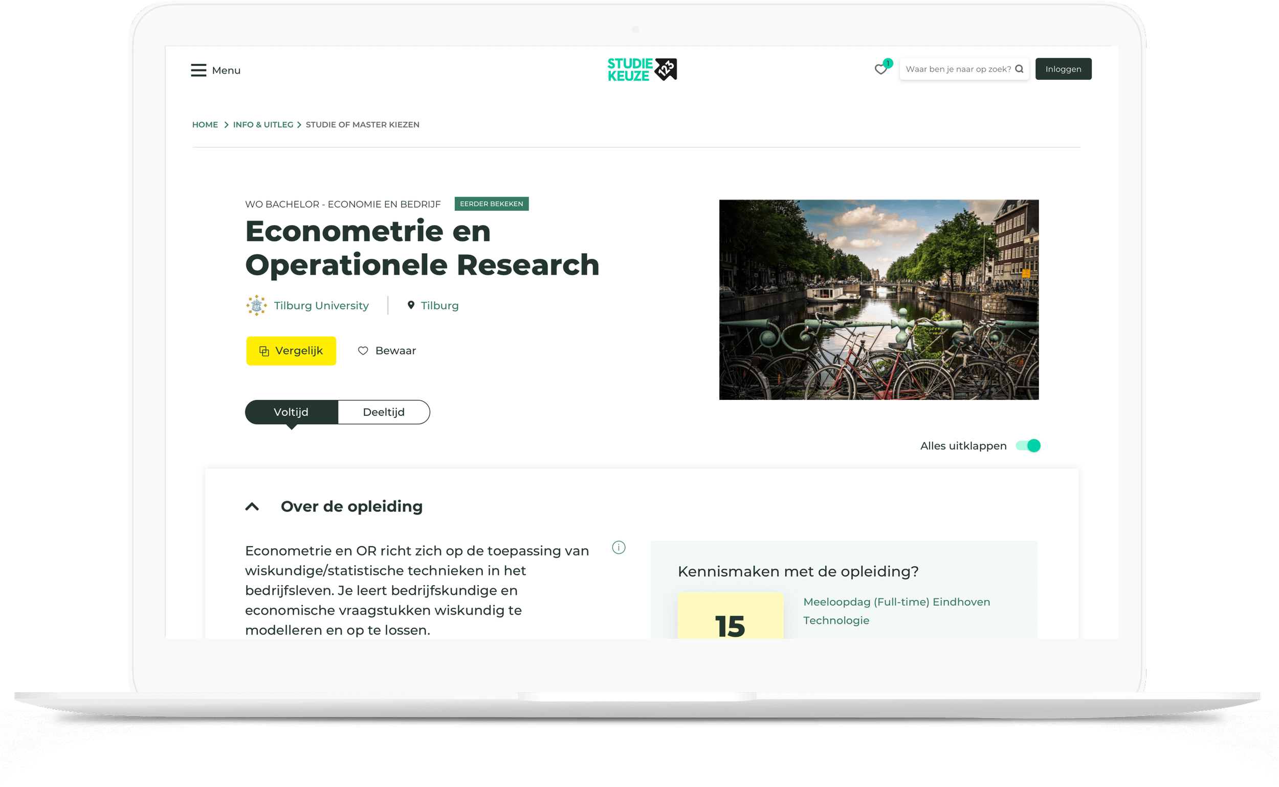 Studiekeuze123.nl is dé vergelijkingssite voor alle erkende hbo- en wo-opleidingen van Nederland. Jaarlijks bezoeken circa 1,5 miljoen studiekiezers, ouders en decanen de site.